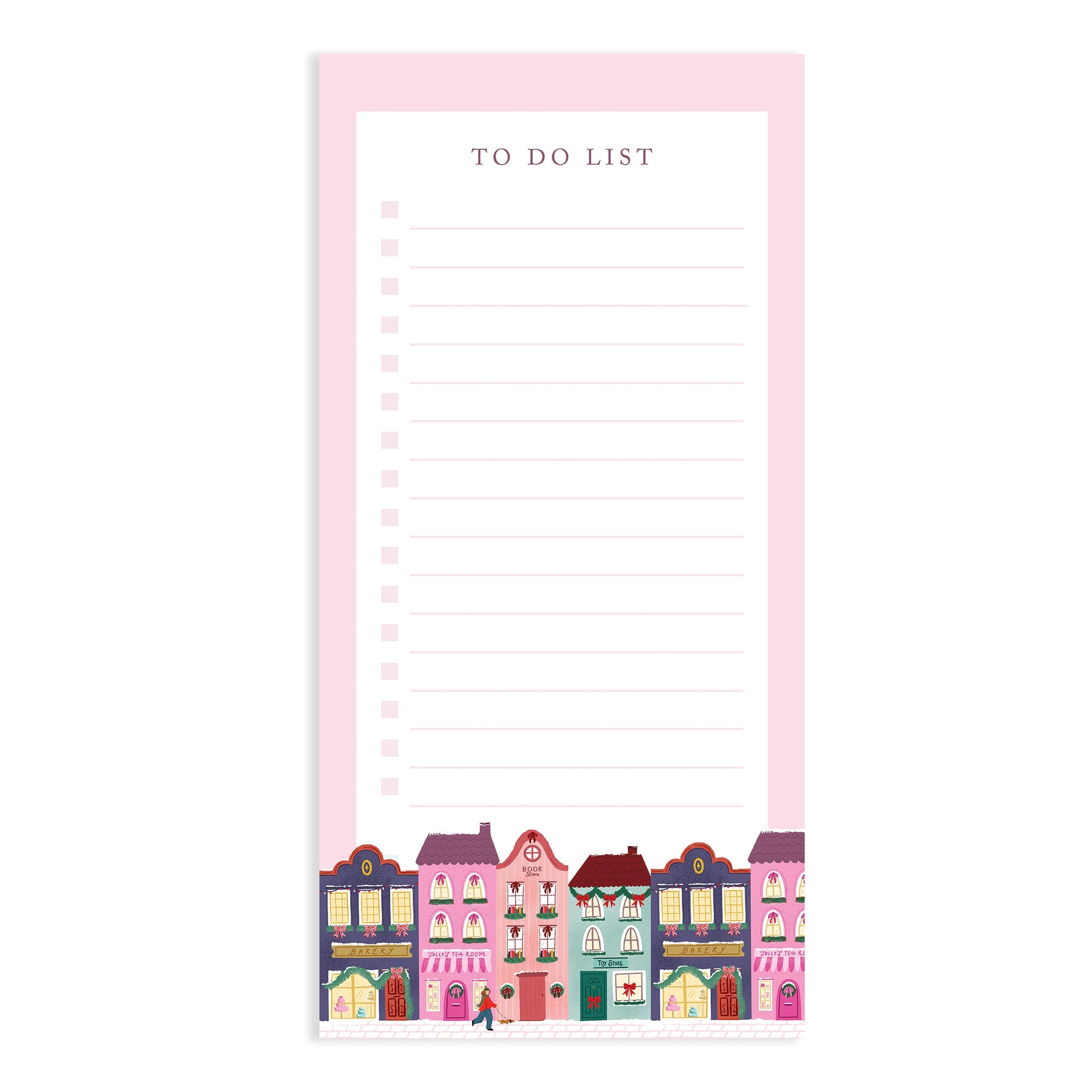 A winter town, to do list notepad featuring a hand-drawn illustration of a cozy holiday village with a bookstore, bakery, tea room, and toy store. This beautiful notepad makes a thoughtful small gift or a lovely stocking filler for book lovers, teachers, and anyone who enjoys the cozy charm of wintertime.